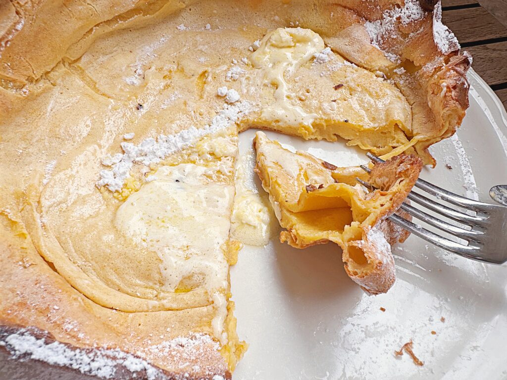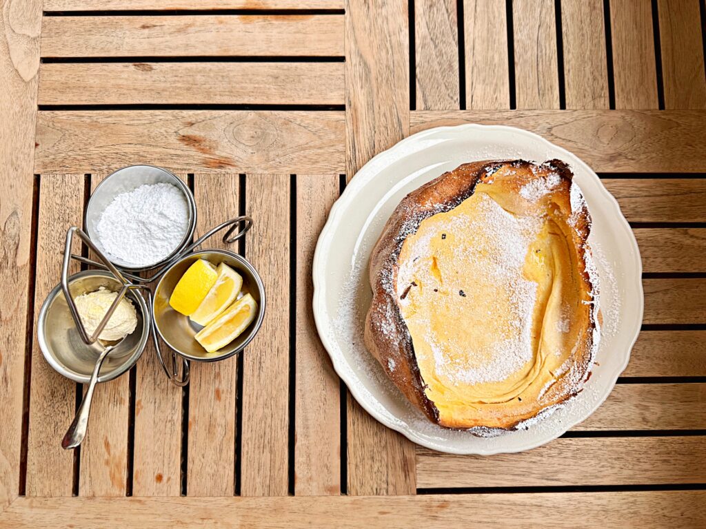 フライパンで焼いて作る通常のパンケーキとは違い、卵をふんだんに使用してオーブンでじっくり焼き上げた「ジャーマン生地」と呼ばれるタイプなのです。生地はサク&ふわ!シュー皮のような味わい。粉砂糖やホイップバター、生のレモンを絞ってでいただくスタイルは初めての体験でした。