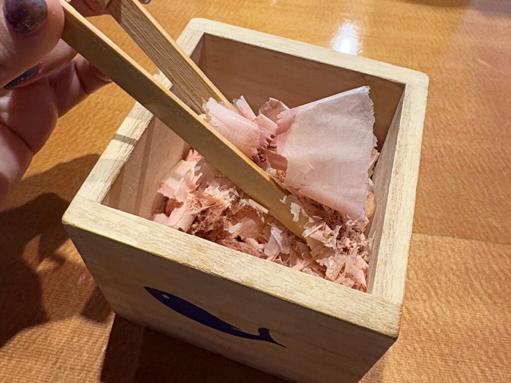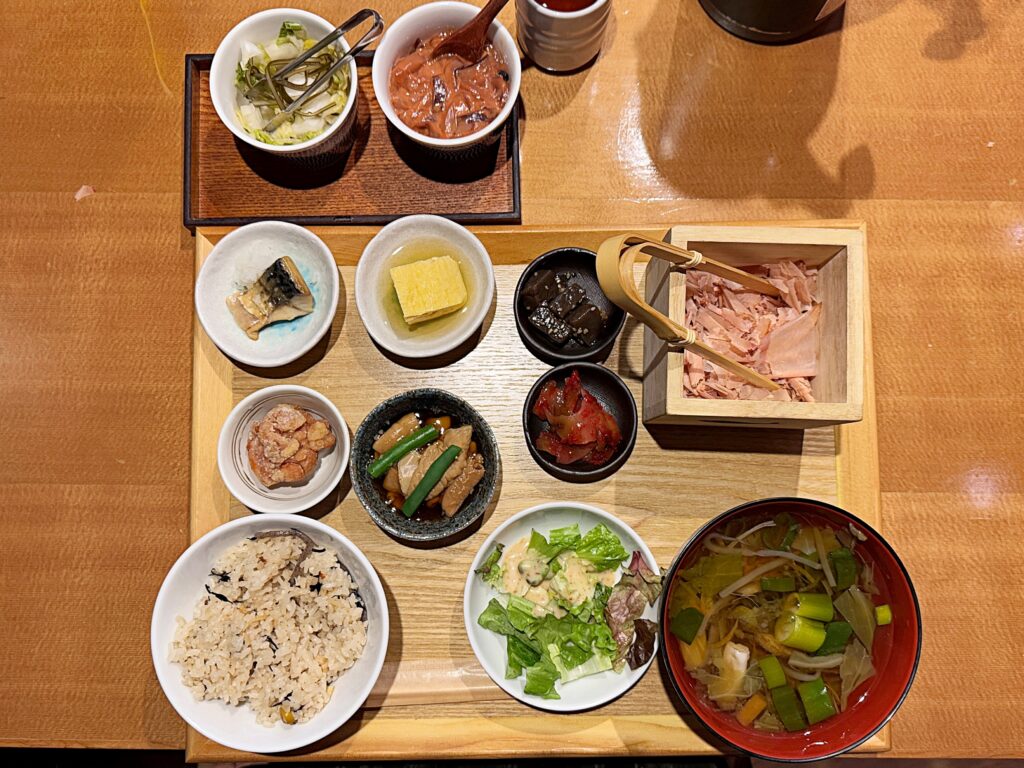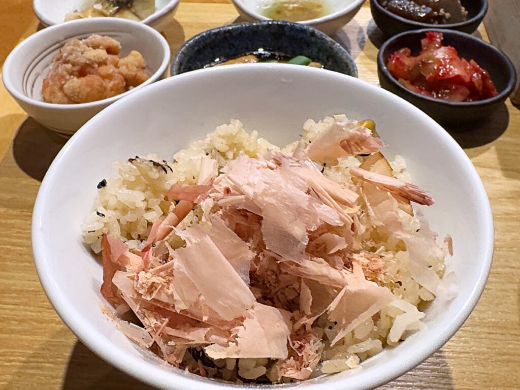 ご飯もおかわり自由!白米だけではなく炊き込みご飯もありました。削り立てのフワフワの鰹節を乗せていただくご飯は見た目も味も抜群!食が進むのは無理もありません。普段から鰹節に馴染みのないしょくたんはすっかり虜になったのでした!なんたって鰹節!ヘルシーの塊みたいなものですし罪悪感ゼロ!ただしご飯の食べ過ぎは気を付けないと…ですね。