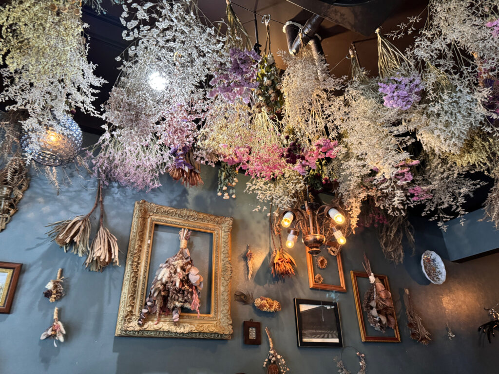 天井からはたくさんのドライフラワーが吊り下げられています。逆・お花畑の状態ですね!10名も入ればいっぱいになってしまいそうな隠れ家のようなお店の神秘的な魅力を倍増させます。思わずずっと上ばかり見てしまいます。「ドライフラワーってこんなにカラフルだったんだ!」と、新たな発見もあったりして楽しい!