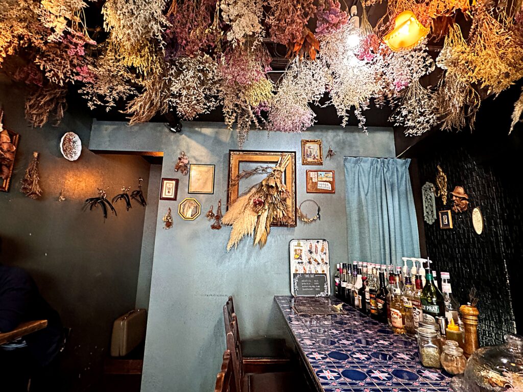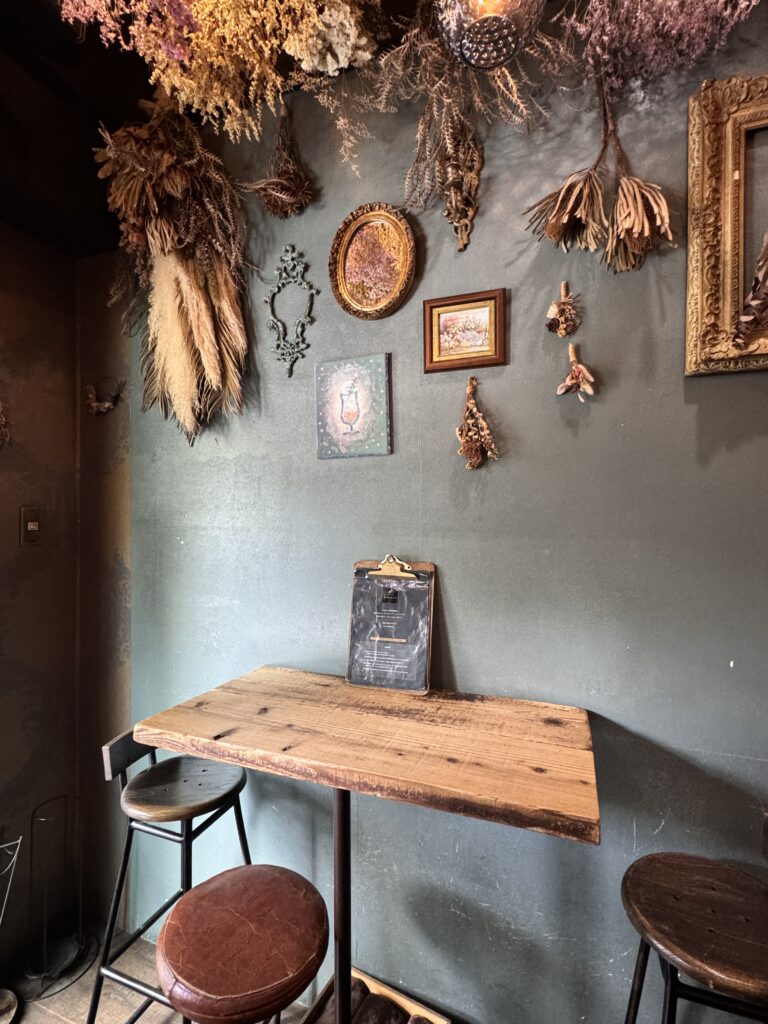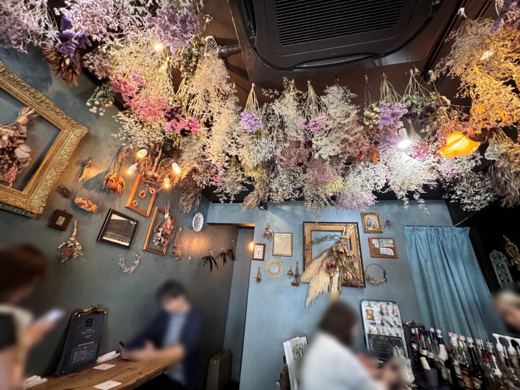 ドアを開けるとすぐに二人掛けの席。天井にはドライフラワー。HANABARとは「花」のBARだったわけですね!
