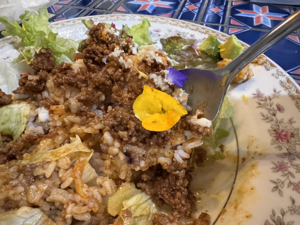 「エディブルフラワー」と呼ばれる食用花を使った目にも鮮やかなタコライスなのです!