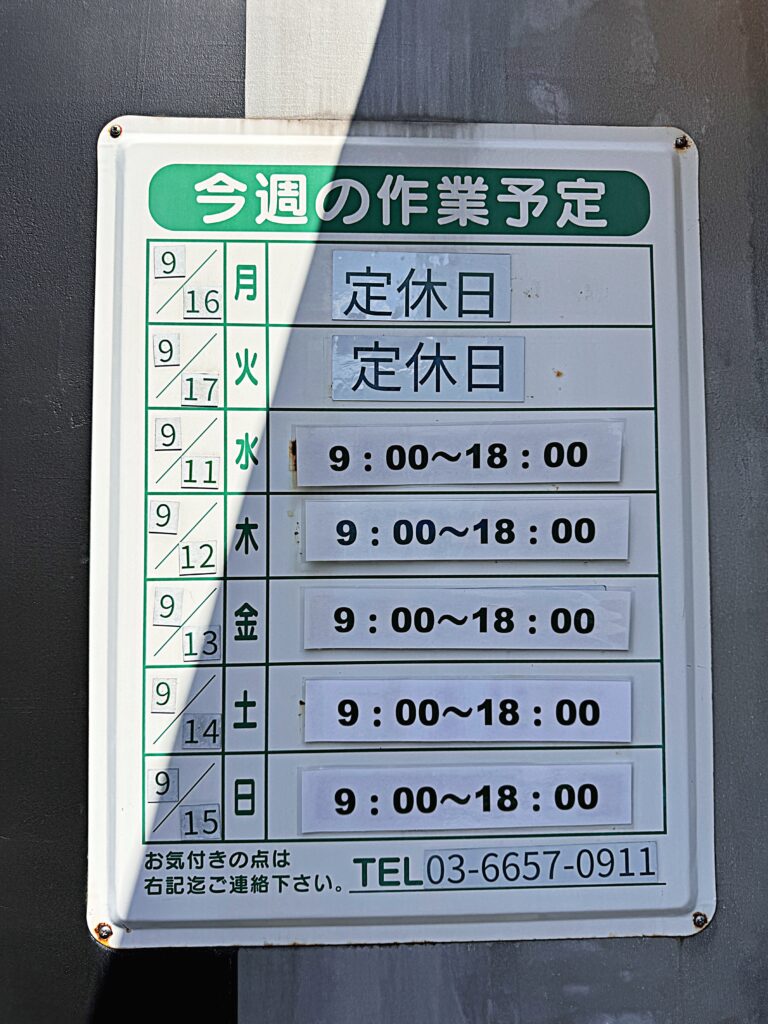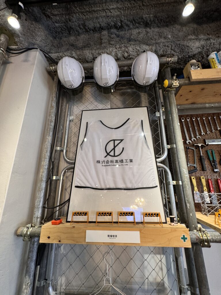 東京スカイツリーの近く、下町文化が残る落ち着いた住宅街を歩いていると見えてきました。入口からしてもう「現場」なのです。建設会社さんがショールームも兼ねて経営されているカフェということで、いたるところに「現場」が用意されているようなのです!