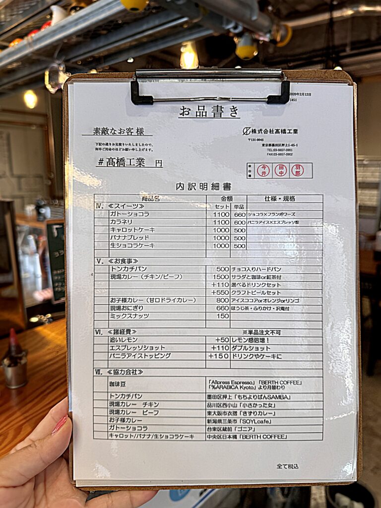 お品書きが作業見積書みたいになってるぞ!遊び心が全開です!
