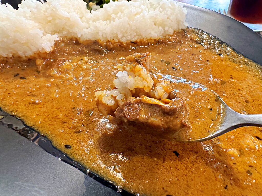 気を取り直して早速ひとくち。クリーミーで味わい深いビーフカレーです!野菜は煮込まれて溶け込んでいるようです。牛肉がごろっと入っています。