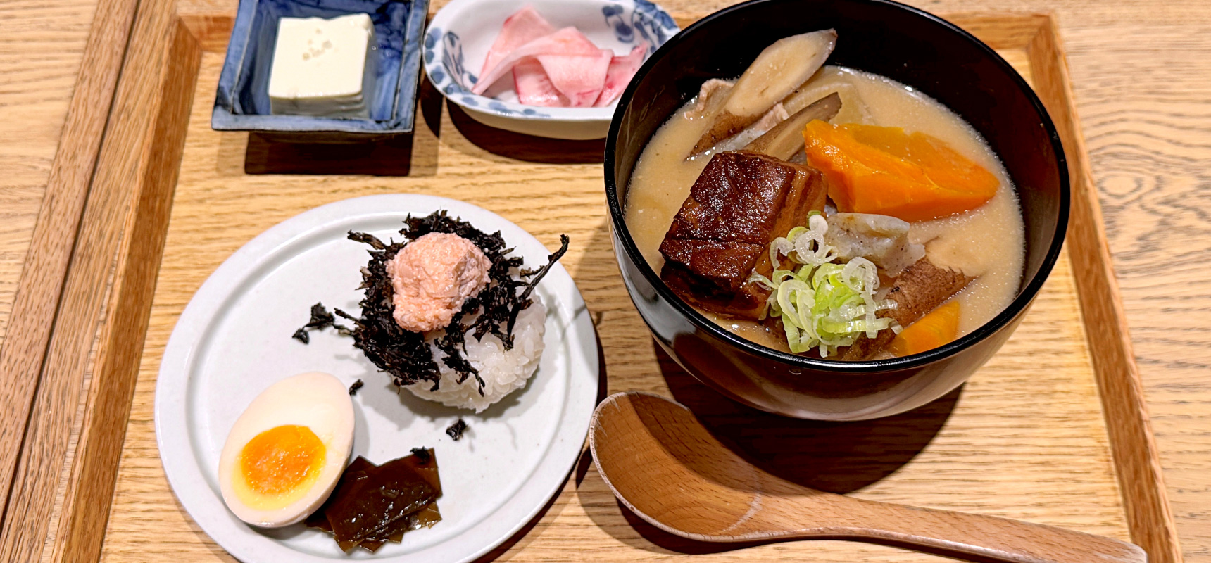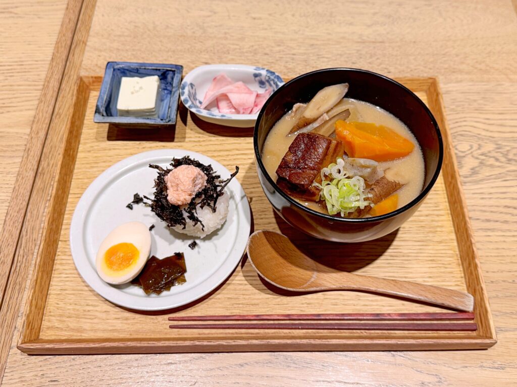 話題になっている「ごろごろ野菜と角煮のすんごいとん汁」のセットを注文し席へ。タイトルからして普通じゃない感じが伝わります。