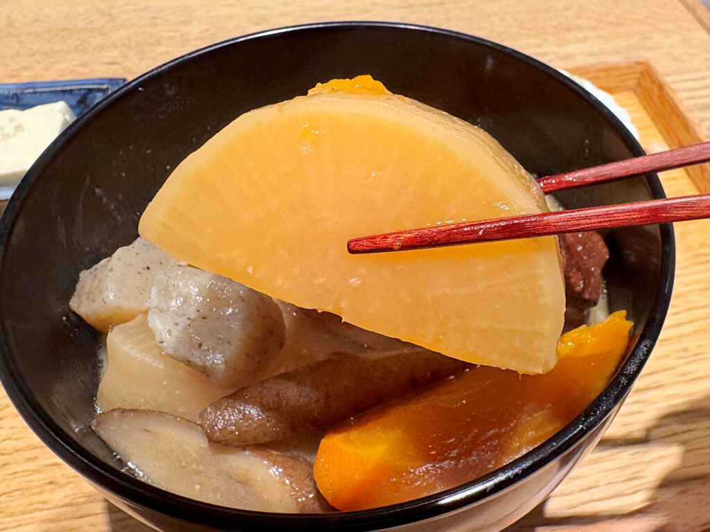おでんか!!と突っ込みたくなる大根。味噌汁が染みこんでキレイな色に仕上がっています。