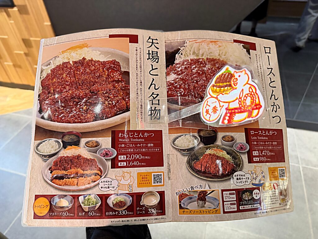 待機列に並んでいる間にメニューを渡していただけます。早速立ちながらメニューブックチェック!豚のキャラクターがすごいかわいいお店なのです!なぜ力士スタイル?