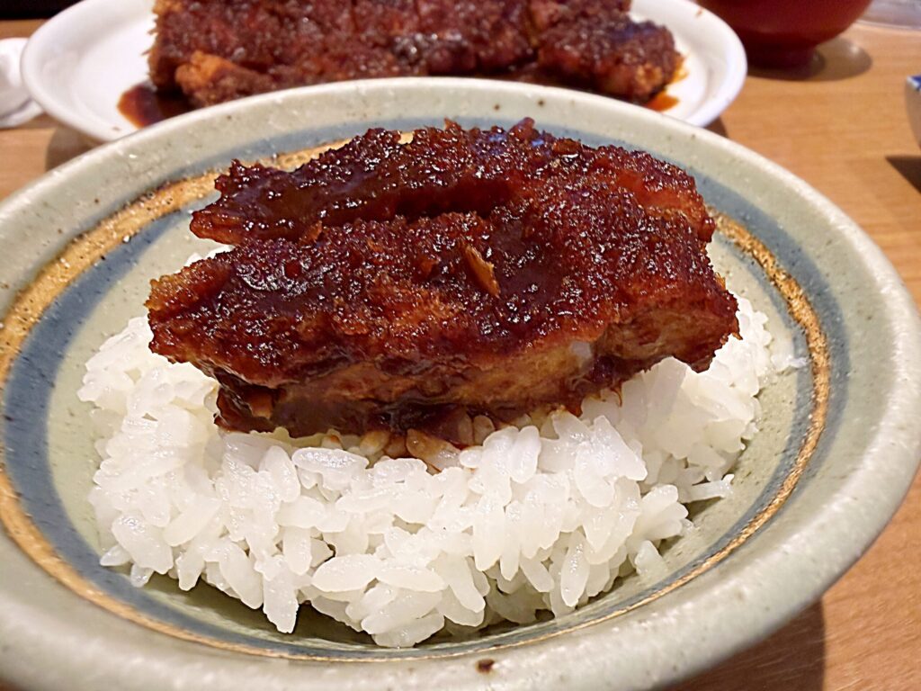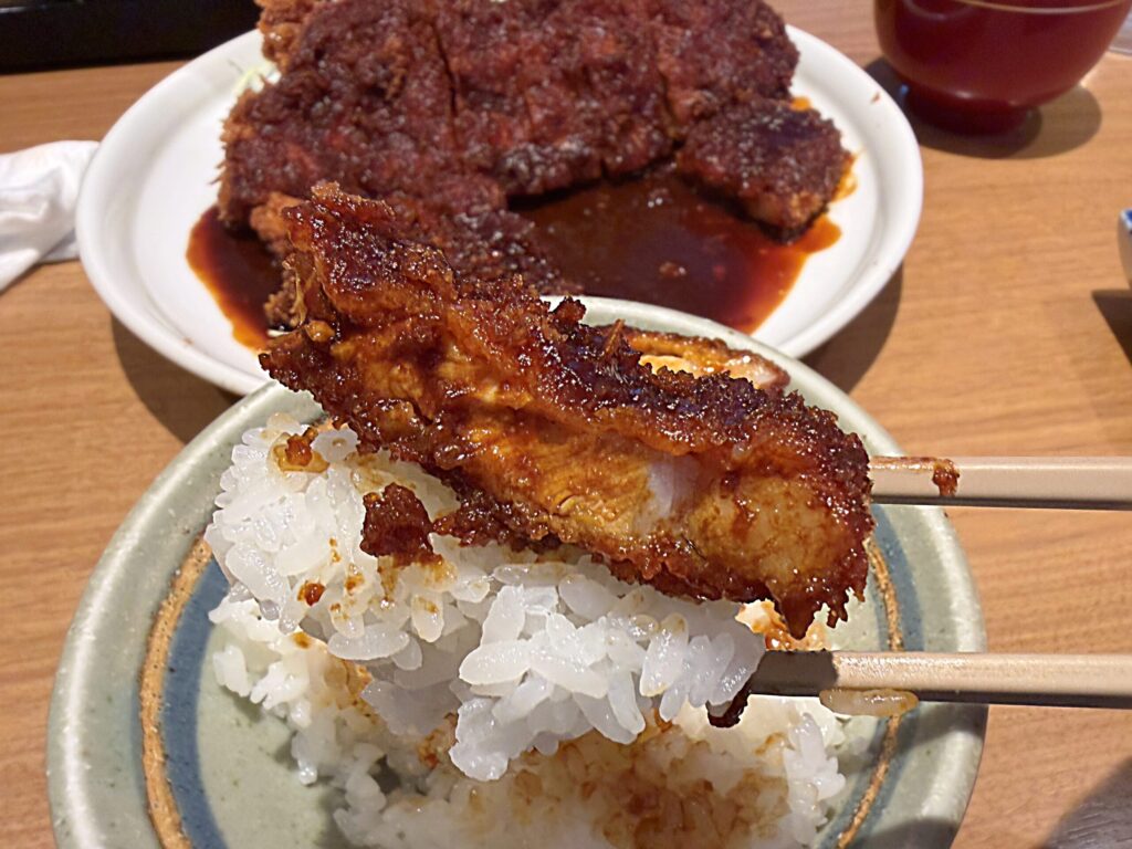 大きなカツのため一口では食べられないけれど、白米と一緒だとさらに美味しさアップ!