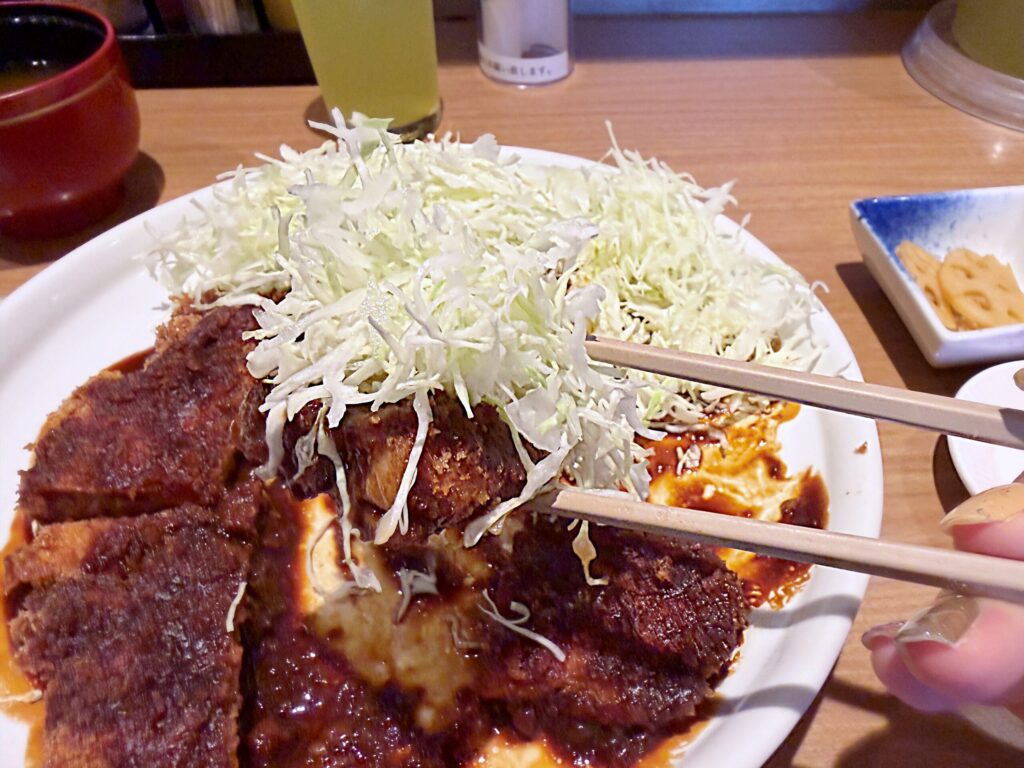 おかわり自由のキャベツ乗せという食べ方もGOOD!なんというアレンジ自在な味噌カツよ。