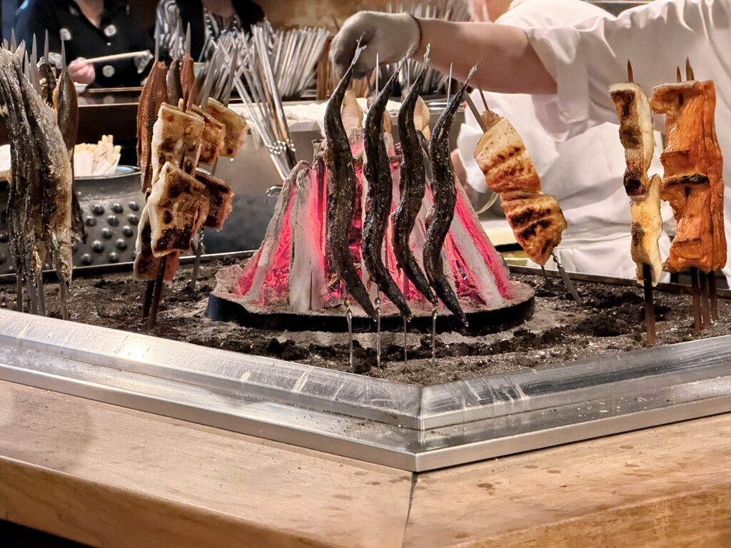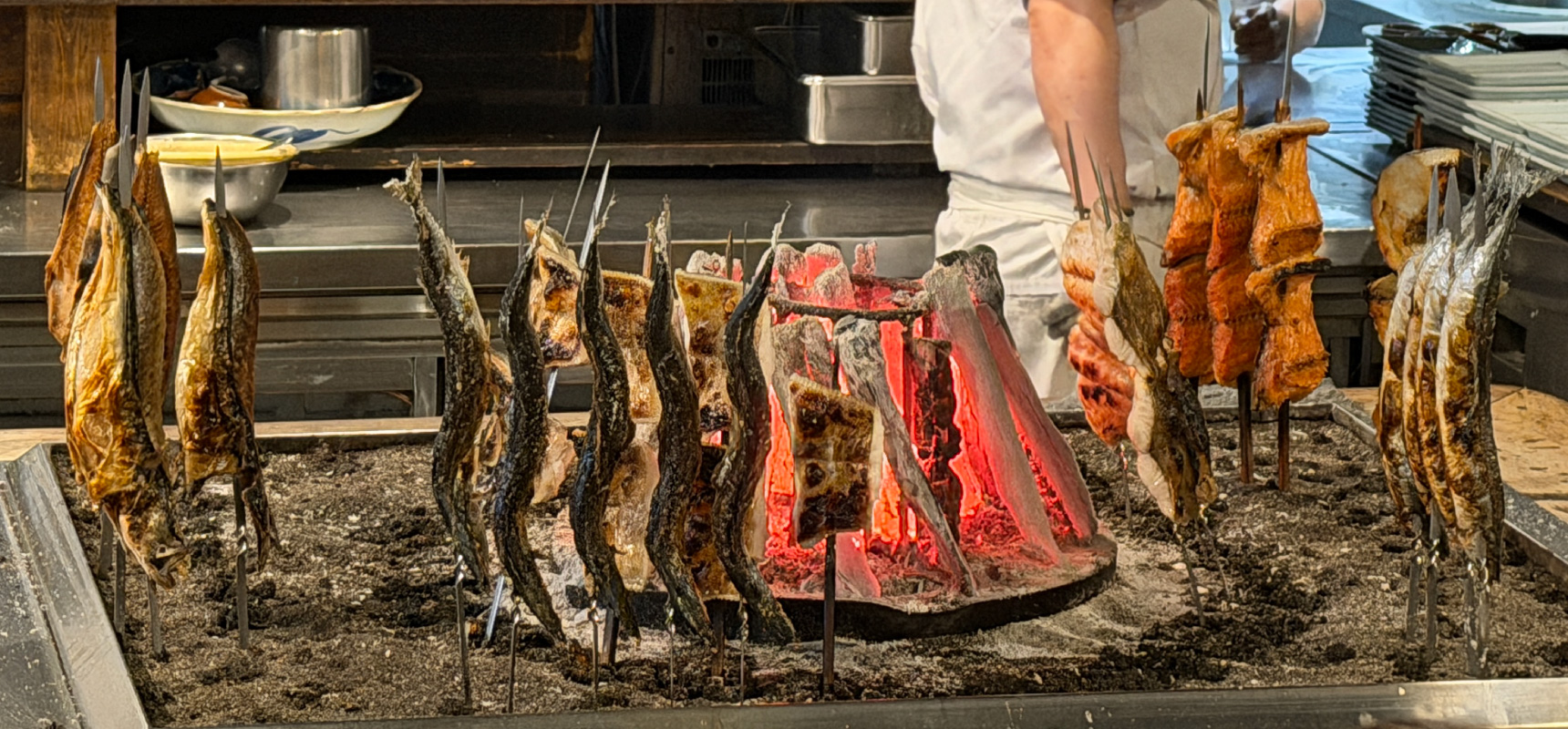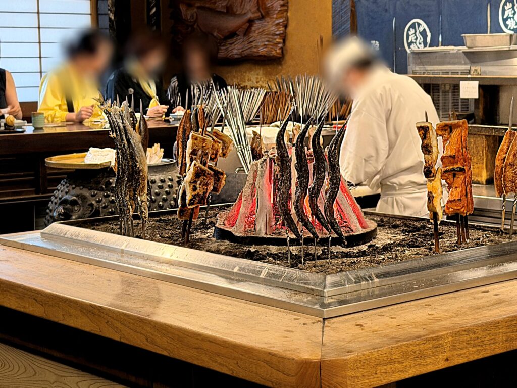 正真正銘の本物の囲炉裏!そしてリアルな装飾物ではなく本物の焼魚!炭を使った昔ながらの焼き方なのでしょうけれど、こんがりとキレイに焼けていてビジュアルは最高!近くにいる職人さんたちはものすごい暑さなのでは!?