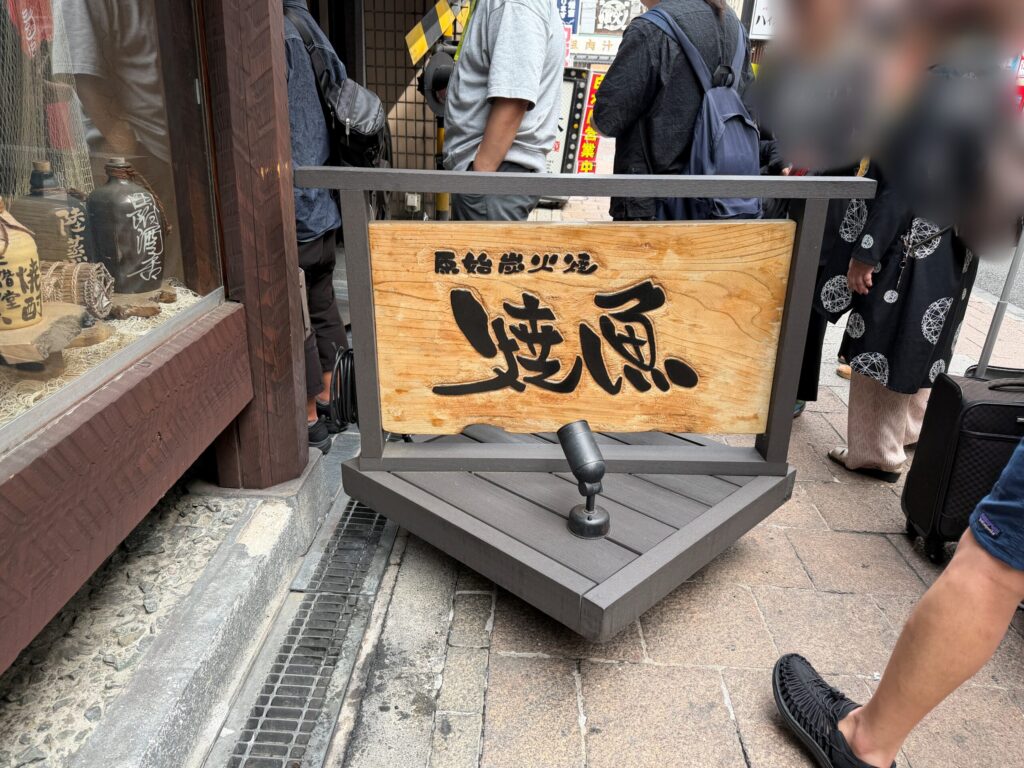 はい!早速現場に到着!「焼魚」の看板、そして大行列。でもまだ締め切ってはいない様子。どうにか入れそうな予感!並ぶぞー!