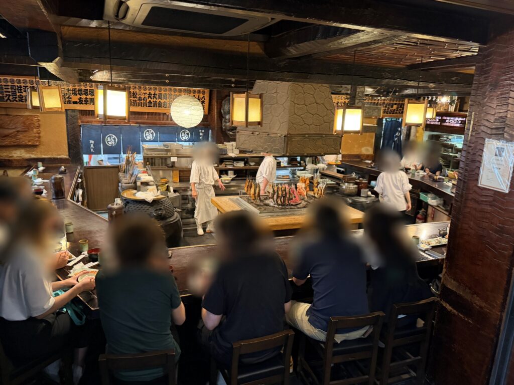 「これだ!SNSで見た店内!」魚が焼かれている囲炉裏をぐるっと取り囲むカウンター席のみ。すごいライブ感!ステージで魚たちがスポットライトを浴びているかのよう!