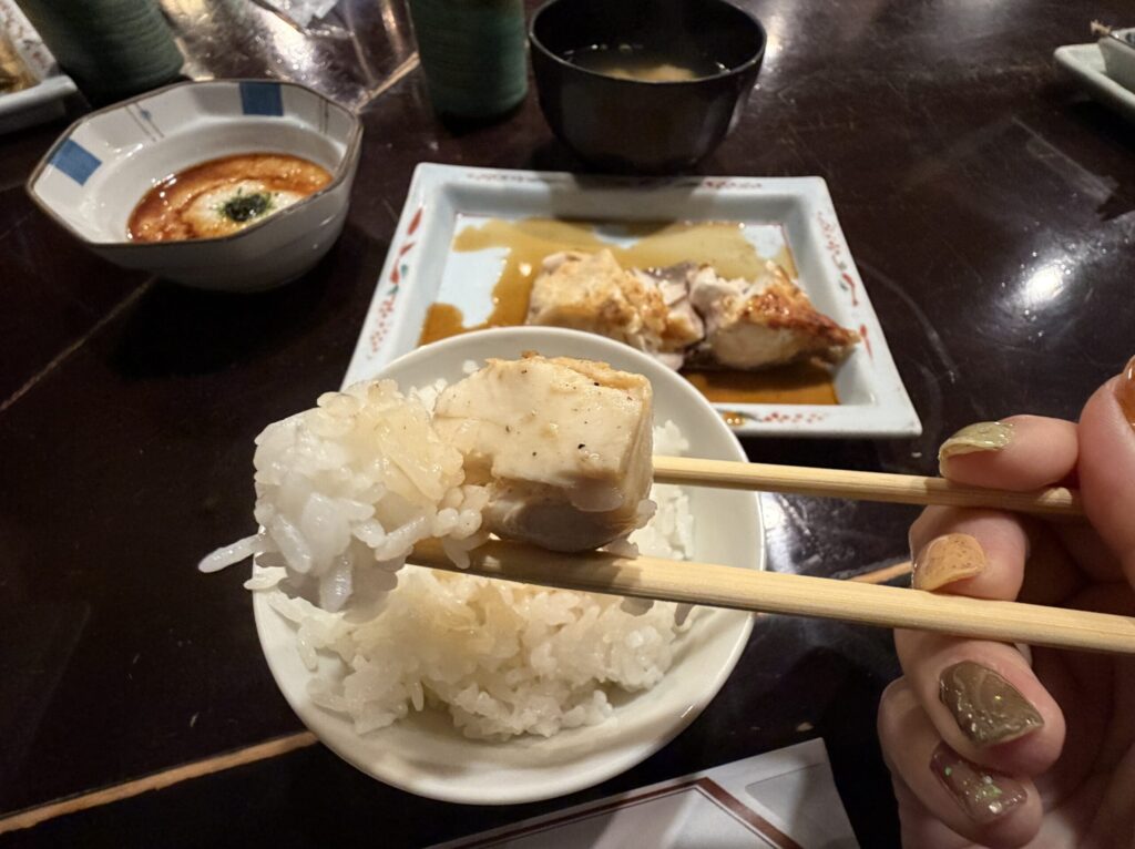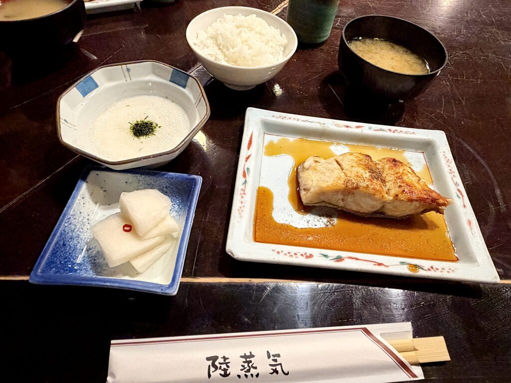 大盛況満員のカウンター席左右に余裕がなく写真が上手く撮れなかったのですが「沖めだい」の定食+とろろです。注文した魚が囲炉裏から外されてやってきたシーンはうっかり見逃してしまいましたが立派な分厚い切り身は美味しそう!