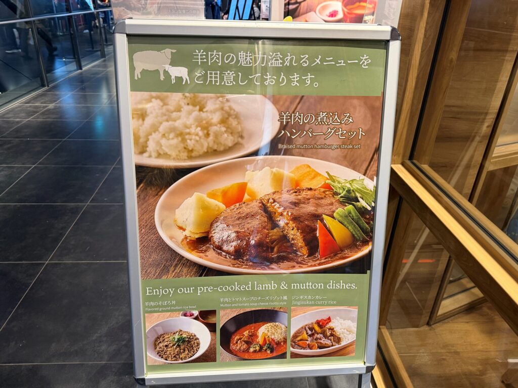 店頭には三角看板もありました。ジンギスカンの他にも羊肉を使った料理としてハンバーグもあるようです。初めてみました、羊のハンバーグ!気になる~!