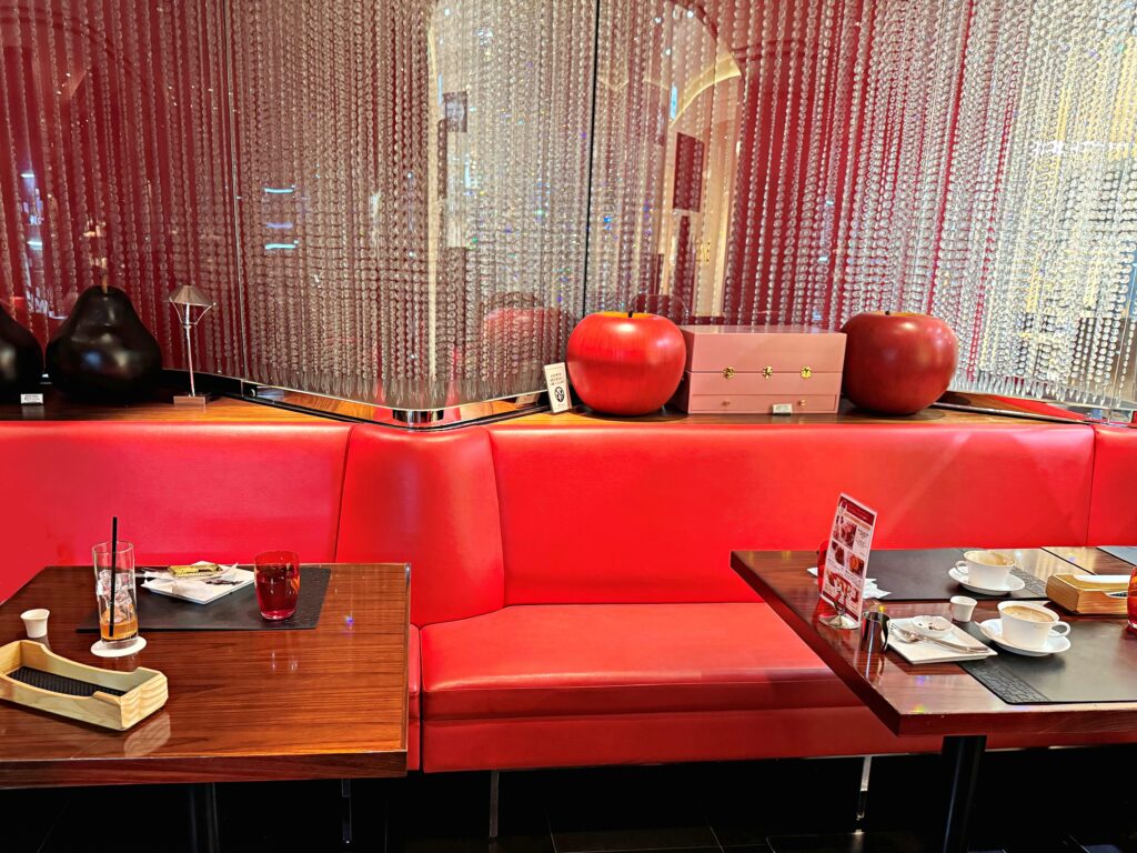 震える足でまずはウェイティングのベンチへ。外に放り出されるわけではなく、ちゃんと待合のスペースがあるのですね。さすが。赤と黒を基調とした洗練された高級感漂う店内。照明を落としていても充分に鮮やかに映えます。
