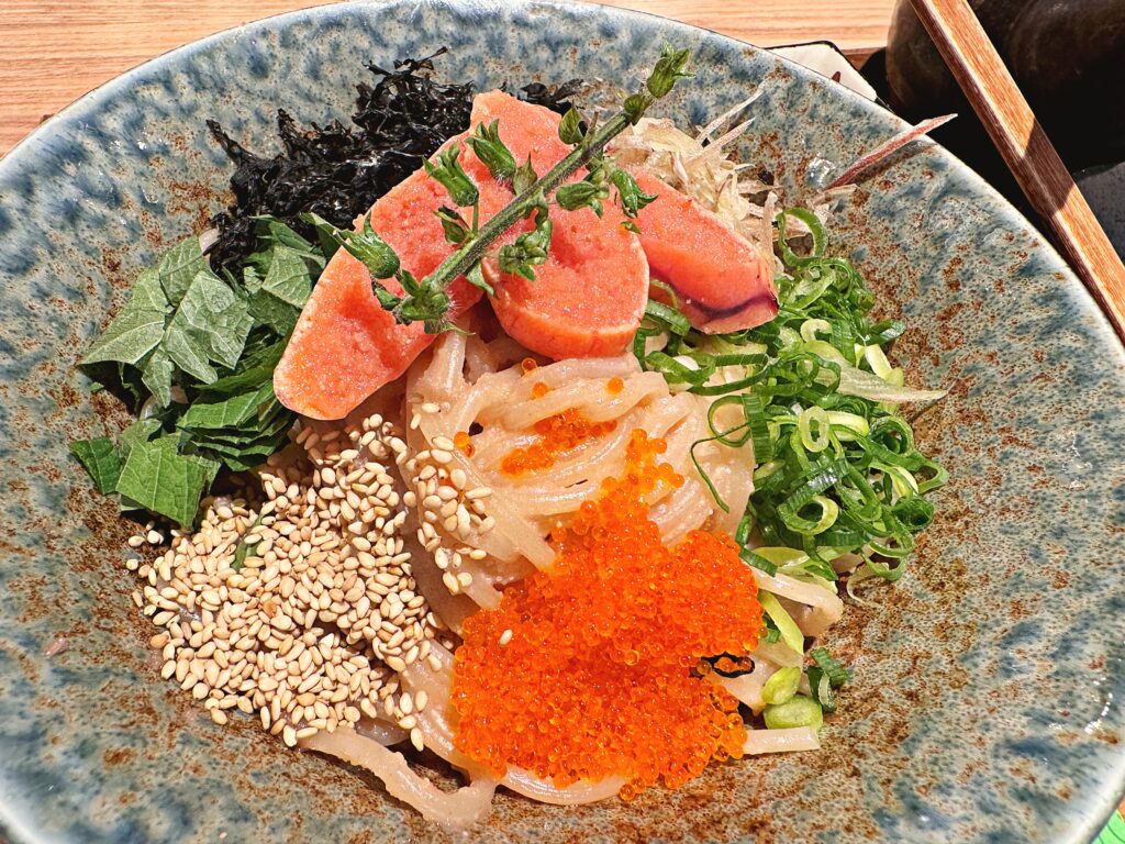 もっちりモチモチ麺がボリュームたっぷり!勿論そのまま食べてもむちゃうま!豊富な薬味の味もガツンときます。まさに純・和風!!