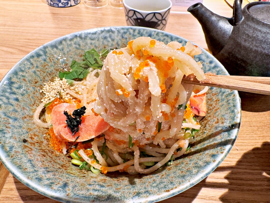 実は具材の下のスパゲティにもたらこがしっかりと混ぜてあり、すでにもう味が出来上がっている感じ!?まずはお出汁は使わずにそのままパクリ!