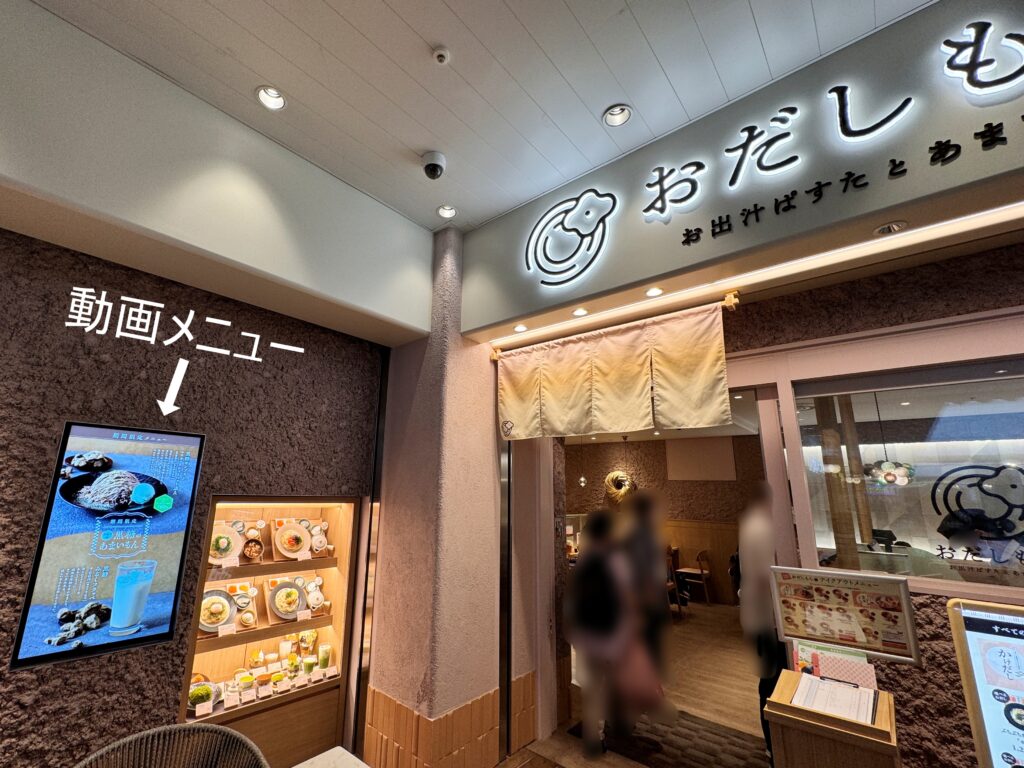 入口にはお店のロゴマークと暖簾。店頭では動画のメニューが流れ、食品サンプルも並びます。お店の中へどんどん人が吸い込まれていきます。あまり馴染みのない海外の方も「出汁動画」を見てから入店されています。