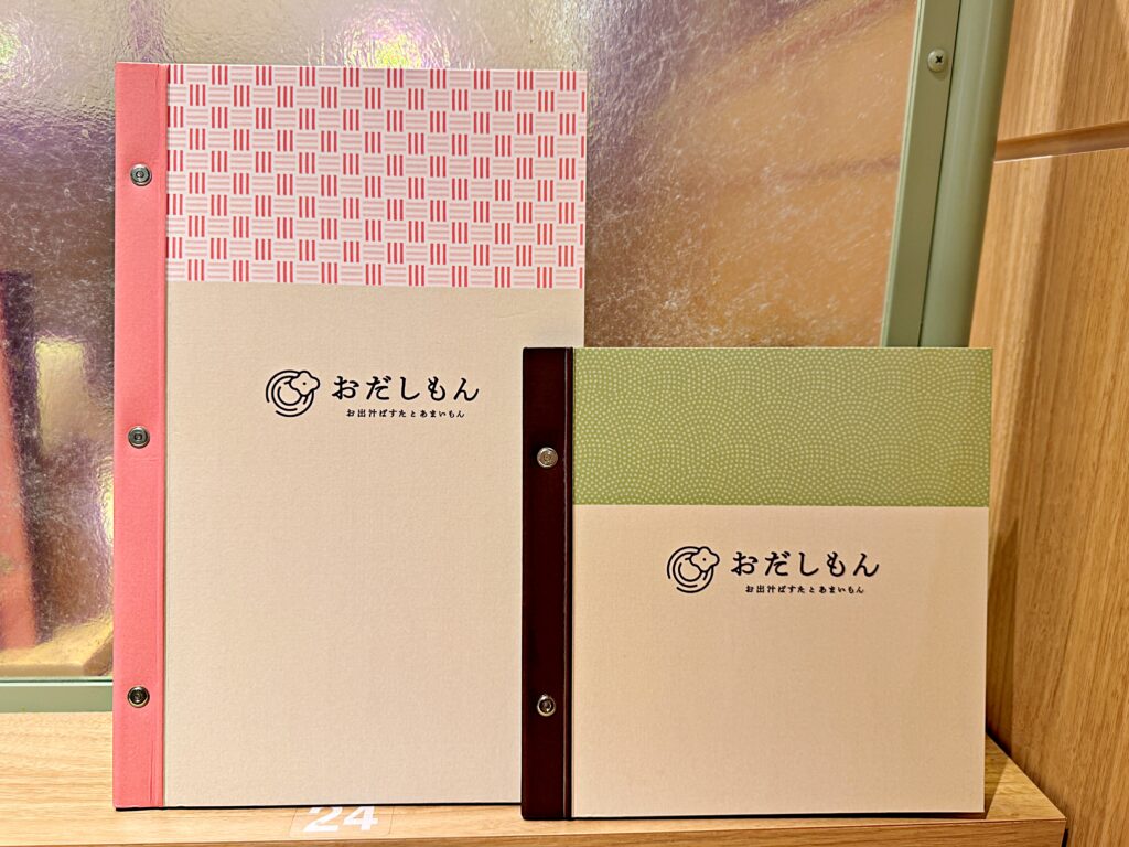 長方形のメニューはお食事、正方形はデザート系です。どちらも和風なデザインでかわいい!ビス留めになっているのでページの増減もできる便利な作りのメニューブックです。
