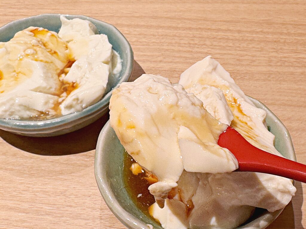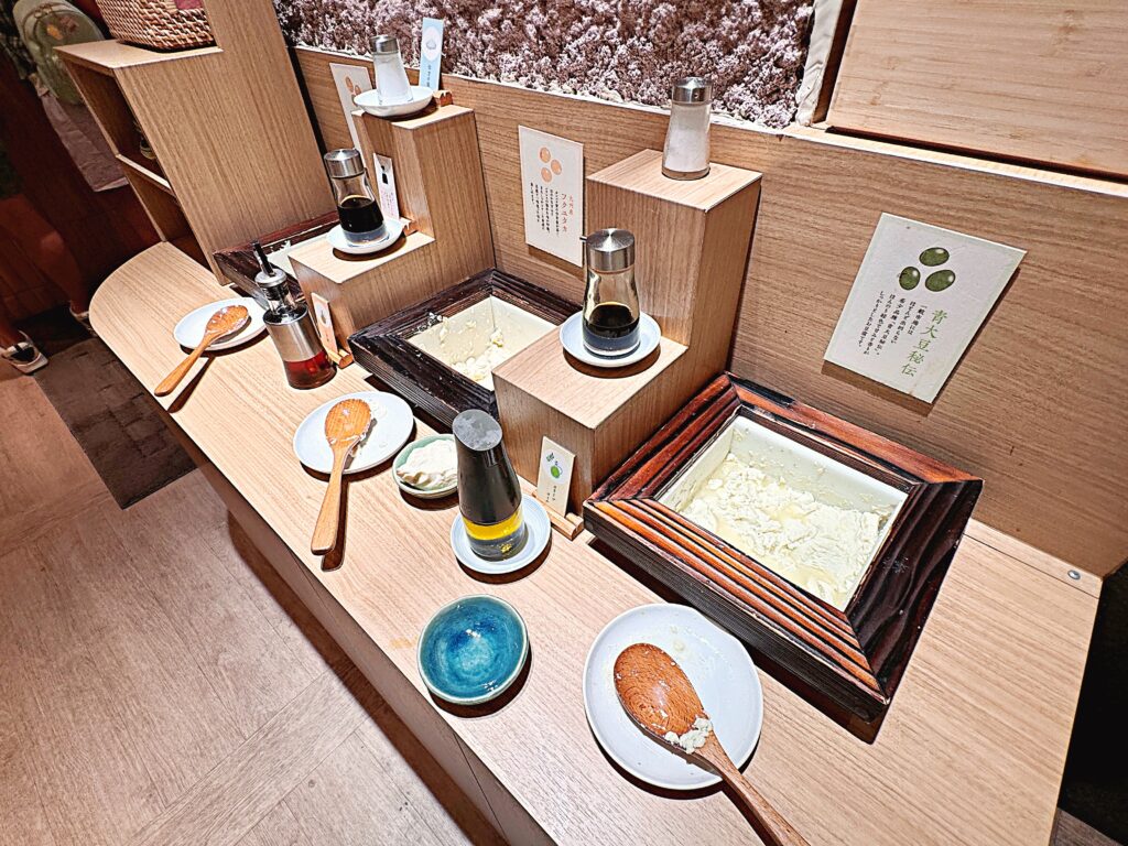 なんと!できたての3種類のお豆腐が食べ放題という嬉しいサービスがあるのです!ほんのり温かくて柔らかいお豆腐が染みわたります。食事前の胃袋に優し~い!