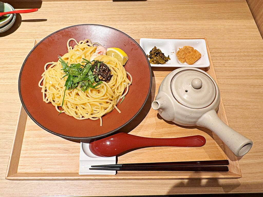 お盆の上にはパスタのお皿と急須と箸休め。「急須の中には出汁が入っているのでお好みでどうぞ」と、店員さん。