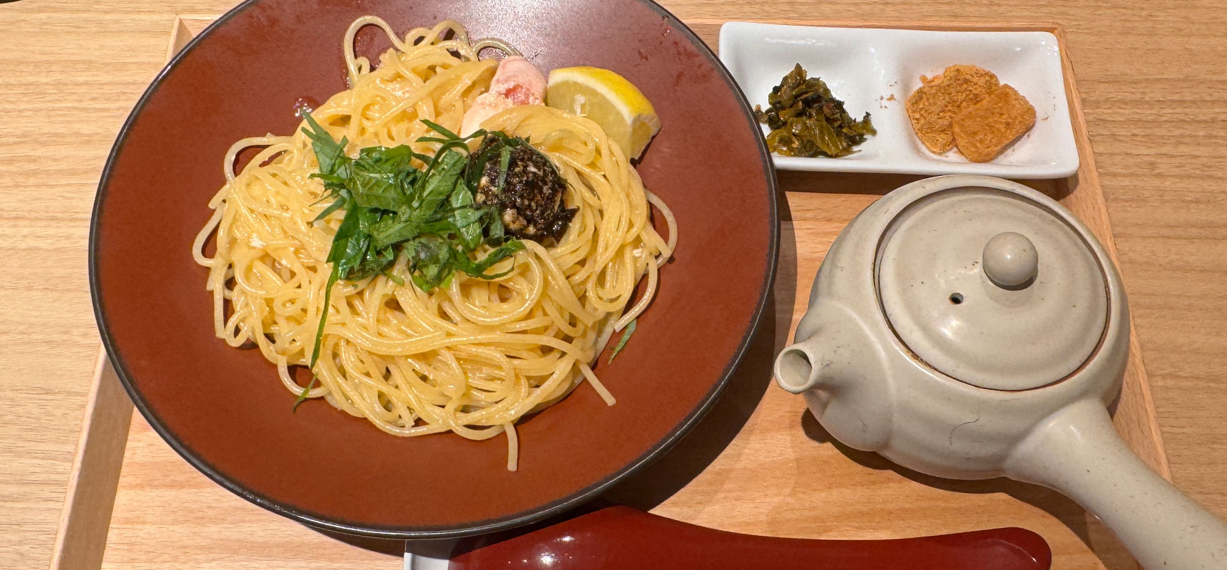 お盆の上にはパスタのお皿と急須と箸休め。「急須の中には出汁が入っているのでお好みでどうぞ」と、店員さん。