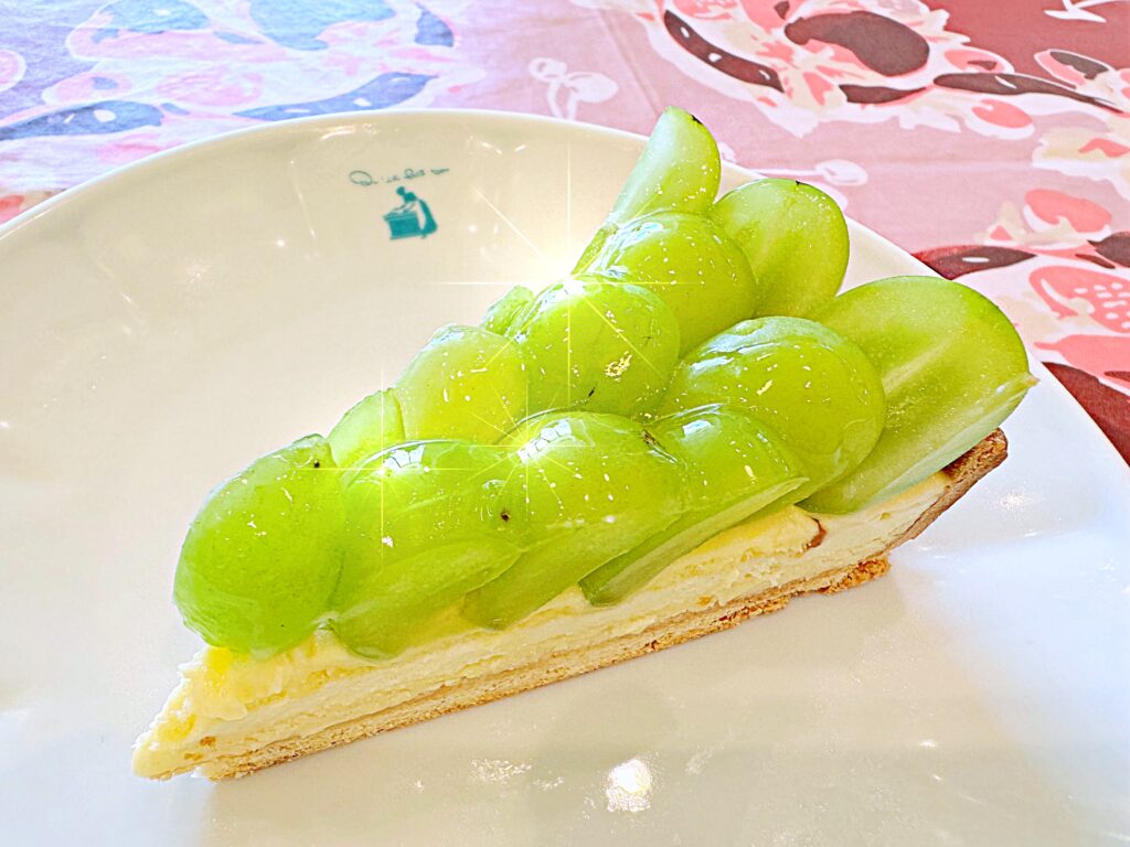 待つことしばらく。「シャインマスカットの宝石箱や~!」と、声をあげてしまいそうなるほどの美しいタルトが登場!カットされた状態でもこの迫力!食べるのがもったいないほどの美しさ!ツヤツヤで綺麗っ!