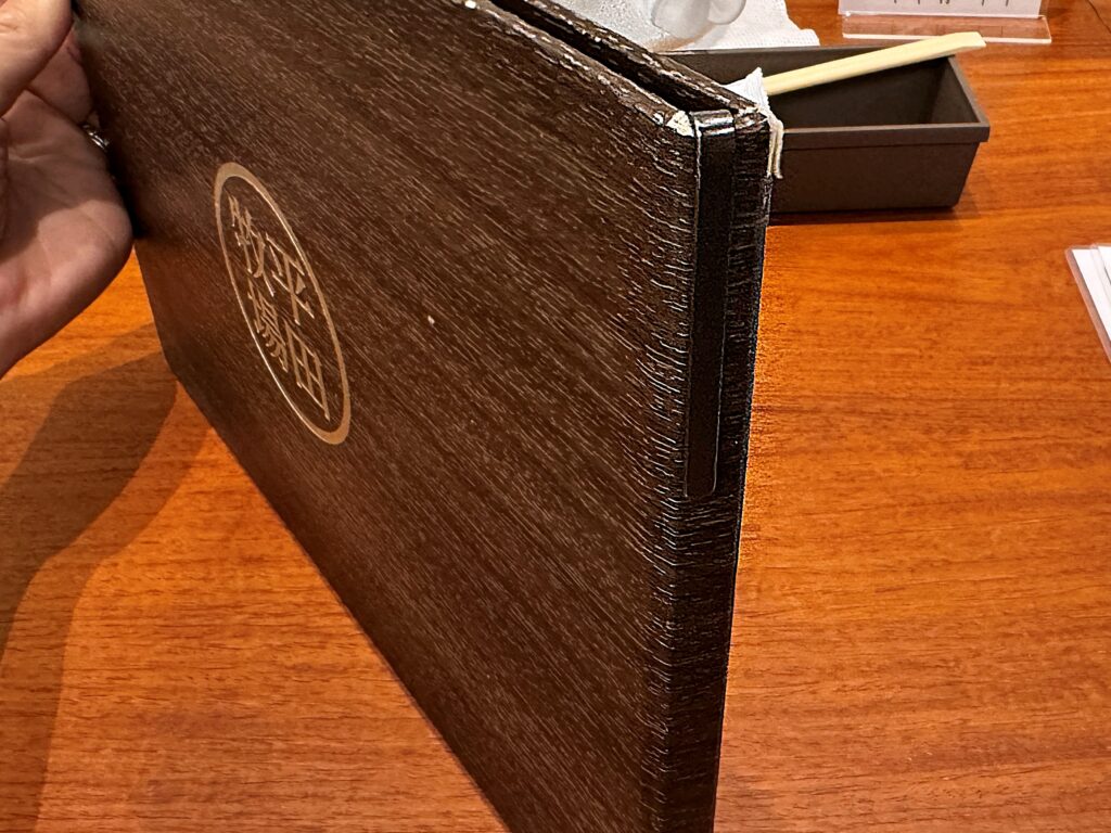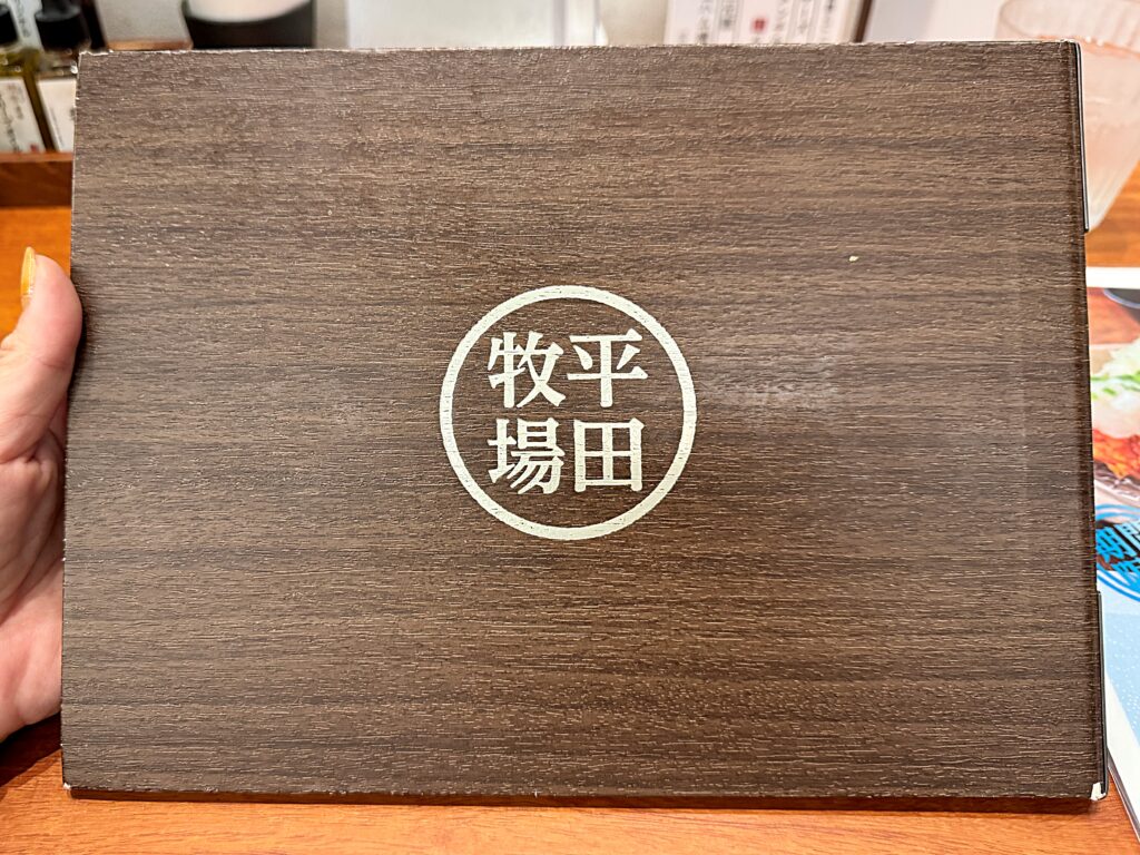 ピン留めタイプのビニールポケットのメニューです。表紙材は焼杉のような色合い。汚れてもサッと拭ける素材です。中心にはトレードマークの「平田牧場」のロゴマークが大きく箔押しで入っています。シンプルですがインパクトがあります。おすすめメニューはパウチ仕様です。写真も大きくて見やすいですね。
