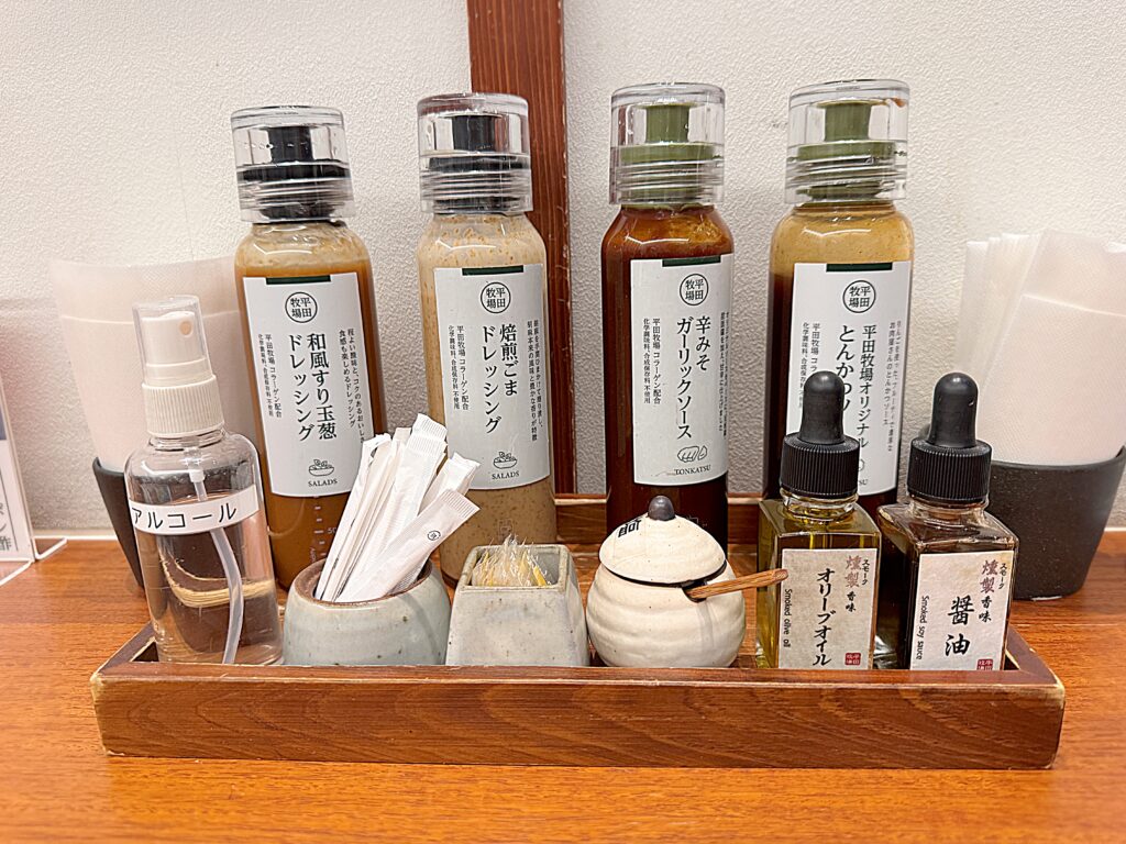 テーブルの上には調味料セットが置いてあります。なんと平田牧場オリジナルのソースやドレッシング!自由に使えるのが嬉しいですね。