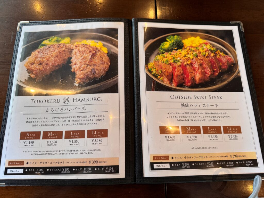 中身もシンプルに白と黒、大きな写真で見やすいメニューデザイン。肝心な価格もOK!むしろこの雰囲気ではお安い方かも。ひと安心で看板メニューの「とろけるハンバーグ」を注文。