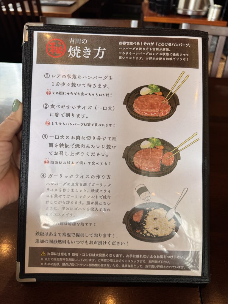 ちゃんと「食べ方ガイド」なるページがメニューブックの最後のページにありました。ガーリックライスの作り方も出ていましたが、店員さんが丁寧に教えてくださったので問題なしでした!