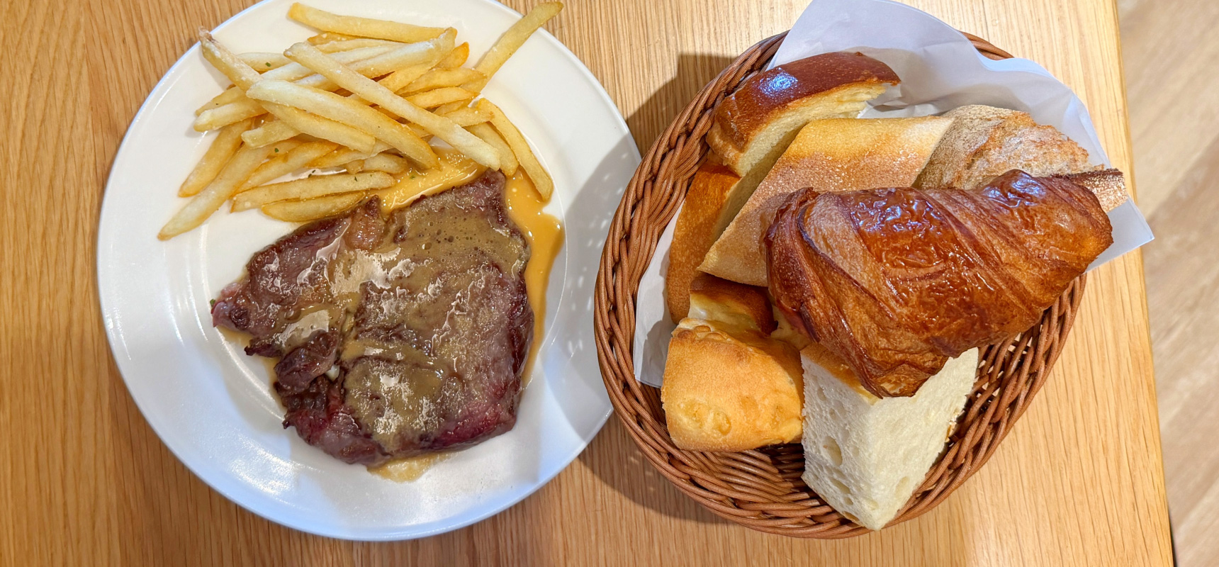 ミートプレートにしました。ステーキには香り豊かなバター風味のソースがかけられています。これまたパンにも負けずいい匂いで食欲をそそります。