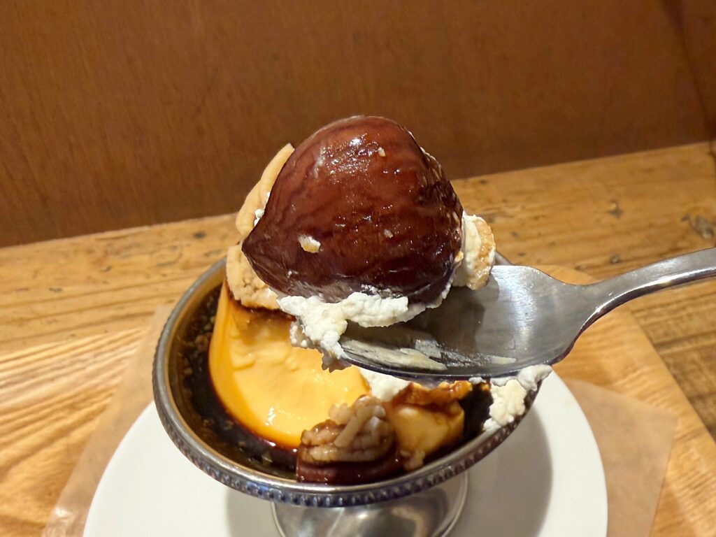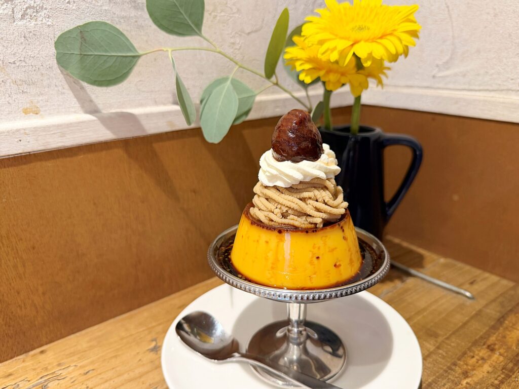 今回しょくたんがいただいたのは期間限定の「利平栗プリン」です!大きなプリンも印象的ですが、その上に乗っかったモンブランケーキのようなトッピングもカワイイ~!そして迫力ありますね~!プリン目当てのお客様も多いことが分かりますね!