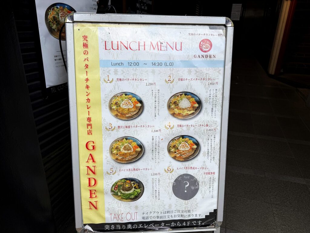 というわけでやってきました!「究極のバターチキンカレー専門店 GANDEN」様です。週3日だけ営業している隠れ家カレー屋さんです。入口にはポスター発見!