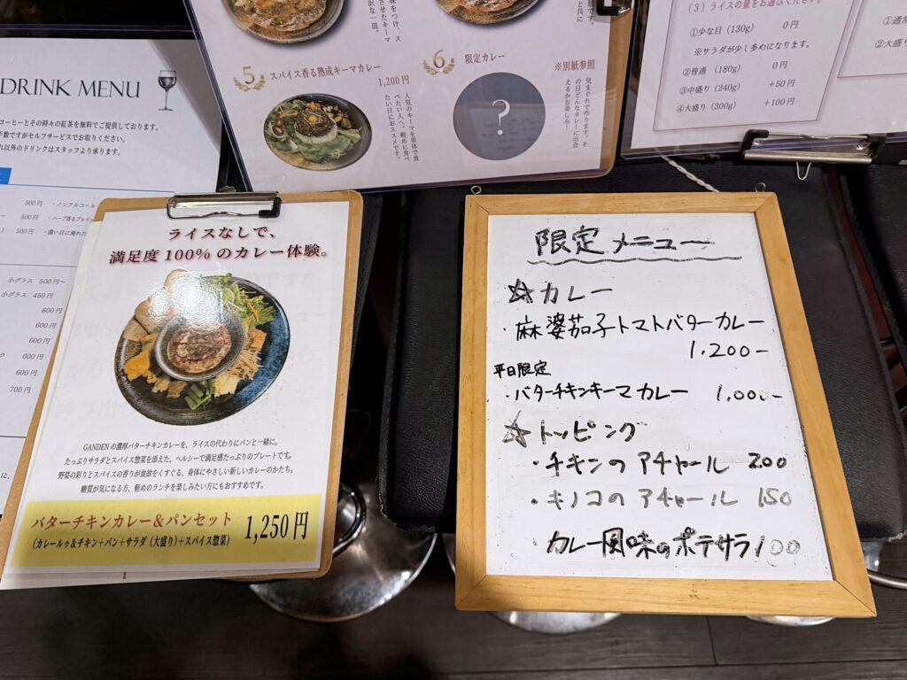 オーダーは席につく前に店員さんと立ち話で決めます。6種類ある個性豊かなカレーに悩みますが、辛い物が苦手なしょくたんは少しでも辛みを鎮めようと「至福のチーズバターチキンカレー」をチョイス!ご飯の量やルウの量、そしてお肉はモモ・ムネから選べます。しょくたんはジューシー優先でモモにしました。