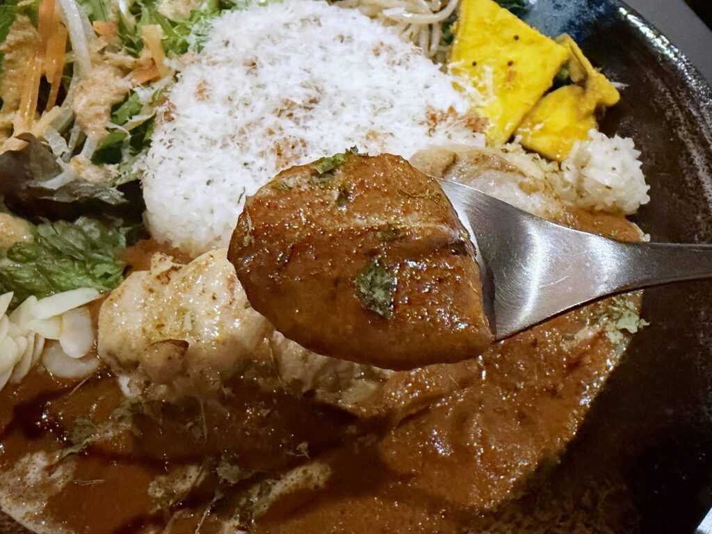…じゅわっと柔らか!チキンだけでもメインディッシュになりそうな味わいです。カレーの中に煮込んでいるわけではない珍しいパターンなのかも。どう食べるのが正解なのか分からないのでひとまずお肉のみ試食してみました。