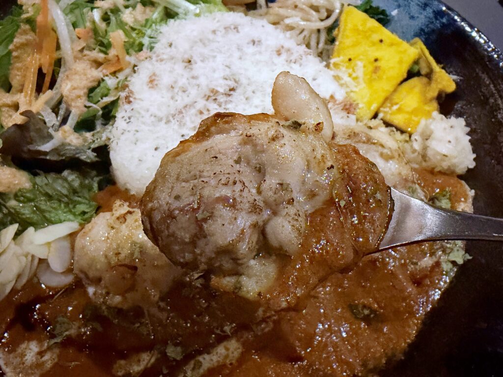 想像の遥か上を貫く味でした。まず最初にお伝えすべきことは「変なクセは一切ない」「思ったより辛くない」という2点。店主のこだわりのチューニングで完成したスパイスのバターチキンカレーということは間違いないのですが、しょくたんの別名「好き嫌いまみれ女王」の舌でも受け入れてくれる寛容な味。トマトの酸味もやわらかく、どこか甘みを感じる優しい味。丁寧に手をかけてルウが作られているのが分かる深い味わいです。つまりこれは誰が食べても「美味しい!」と言うこと間違いないし!
