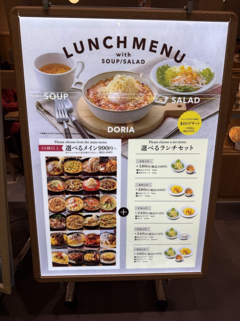 入口には大きなポスター!あったかトローリなチーズのドリアが美味しいそう!夏の涼し気なメニューデザインから一変してあたたかい暖色系の販促物が増えました。さて、行列に並びましょう。