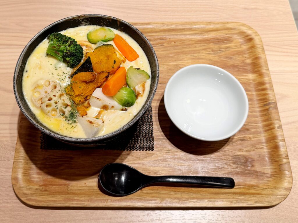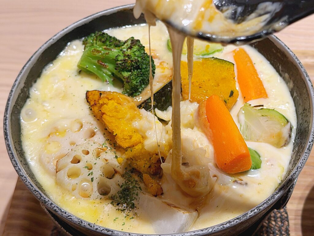 やってきました~!しょくたんが注文したのは「冬野菜のチーズフォンデュドリア・味噌チーズフォンデュ味」にプラスして「ラクレットチーズ乗せ」です。