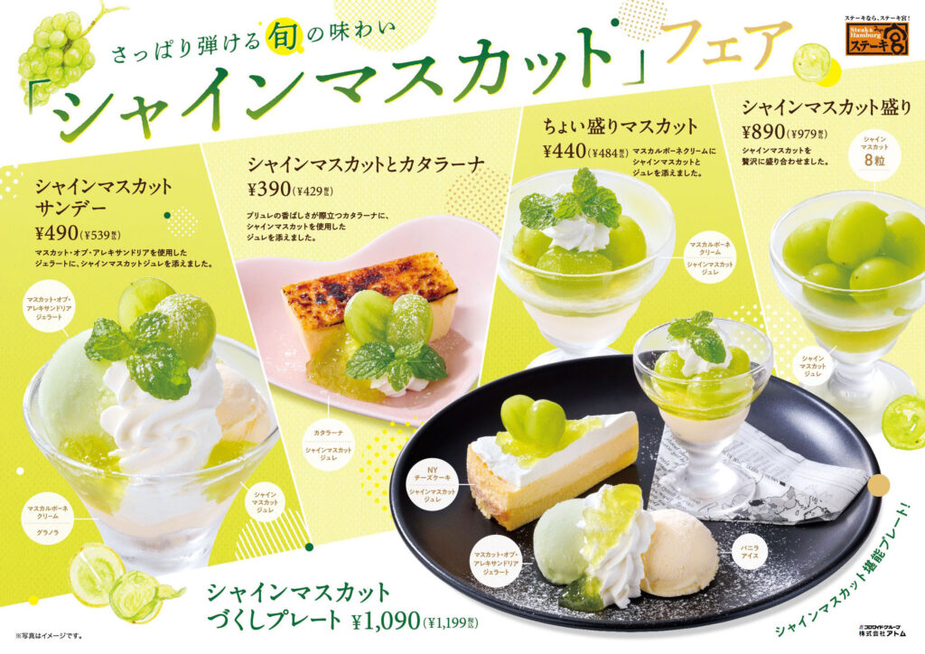 フルーツを主としたメニューデザインではその果実の色を活かしたカラーを使用し、パッと見の直感で何ノフルーツを使ったデザートなのかが分かる工夫をしています。満腹でもついつい追加で頼んでしまいます!