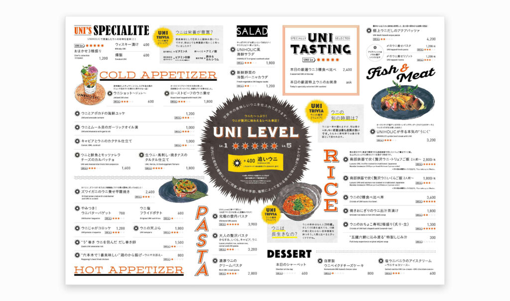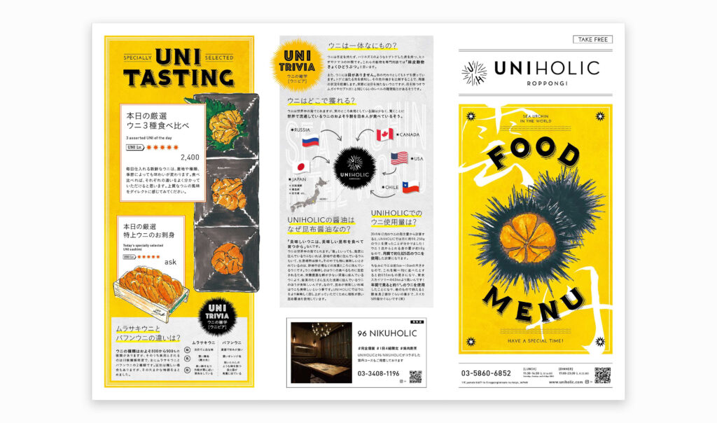 当案件は1店舗のみの個店ということもあり、新規客の取り込みなども考慮してTAKE FREE形式の三つ折りメニューにしました。高級食材であるウニのイメージを身近に、カジュアルに見せるため親しみやすいイラストを多用しました。食べる以外にもメニューを見てもウニの魅力を感じてもらえるようにウニ情報(ウニビア)などを記載して読み物としても楽しめる内容にしました。