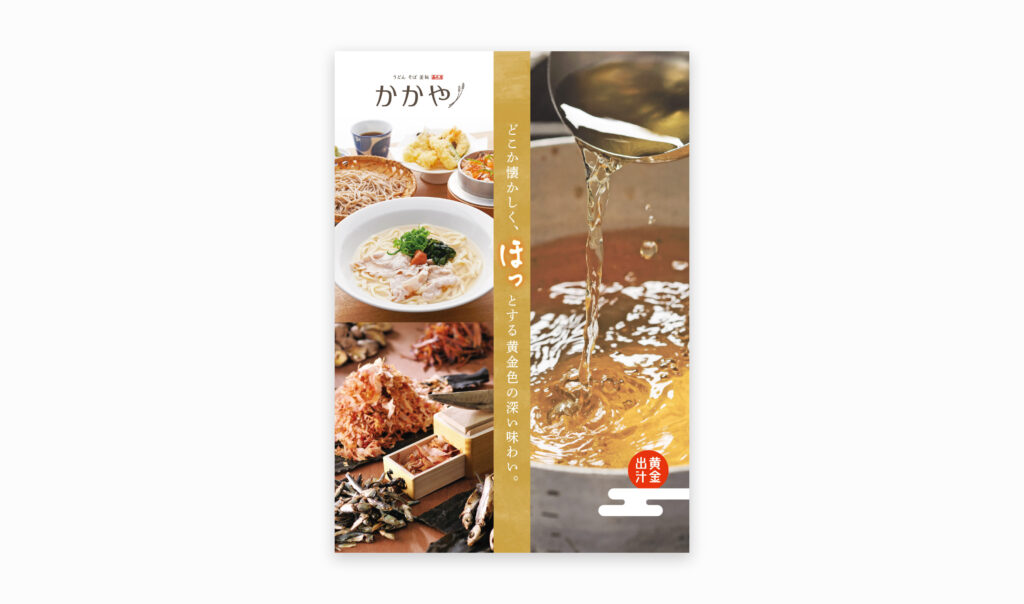 おだしうどん 嘉禾屋の派生業態として営業している『おだしうどん・釜飯かかや 武蔵小杉店』が業態変更となり、おだしうどん・釜めしに加えて「そば」をメニューの柱に加え、より幅広い集客を目指す形となりました。フロア競合店舗との差別化・同年に業態変更を行ったルミネ新宿のKAKAYAほどカジュアルになり過ぎず休日のファミリー層にも入りやすい程度の「うどん」・「釜飯」・「そば」の専門性・本格派を感じる業態としてグランドメニューのカバー・本体デザイン・s/c上の甘味パネルなどメニュー・訴求ツールの他、最重要ポイントであるファサードも担当させていただきました。今回のリニューアルの目的は単なるメニューのリニューアルでは無く「新しいお店がオープンした」と感じさせるために、集客の課題であったファサードの弱さの是正でした。店頭で何の店なのかの認知をインパクトもって引き込む。そして「うどん」・「釜飯」・「そば」と聞くとどことなく古臭く感じるものを若い世代にも入りやすい印象付けポップアートの様な店頭壁面のデザインとそれに連動したツールデザインにしました。