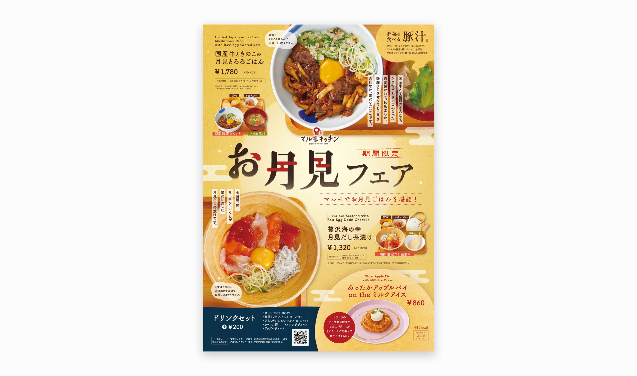 料理自体に派手な「お月見感」がなくても、タイトル文字を工夫することにより全体のデザインを通じて一貫したテーマが窺えるデザインにしています。