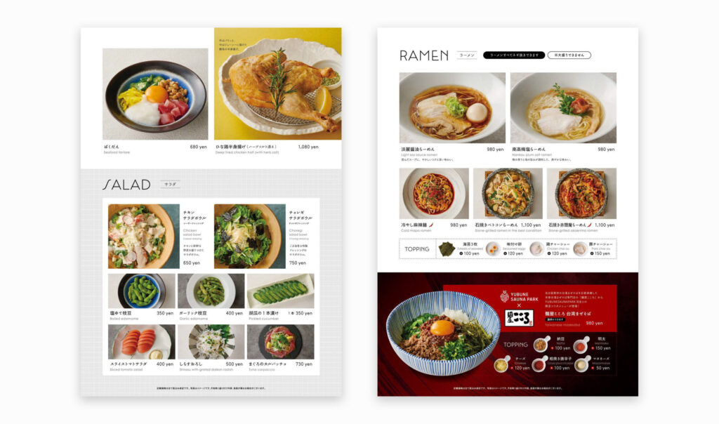 株式会社グリーンクロス YUBUNE SAUNA PARK 羽生 グランドメニュー アートディレクター/長尾 デザイナー/鈴木(彩) ディレクター/長瀬