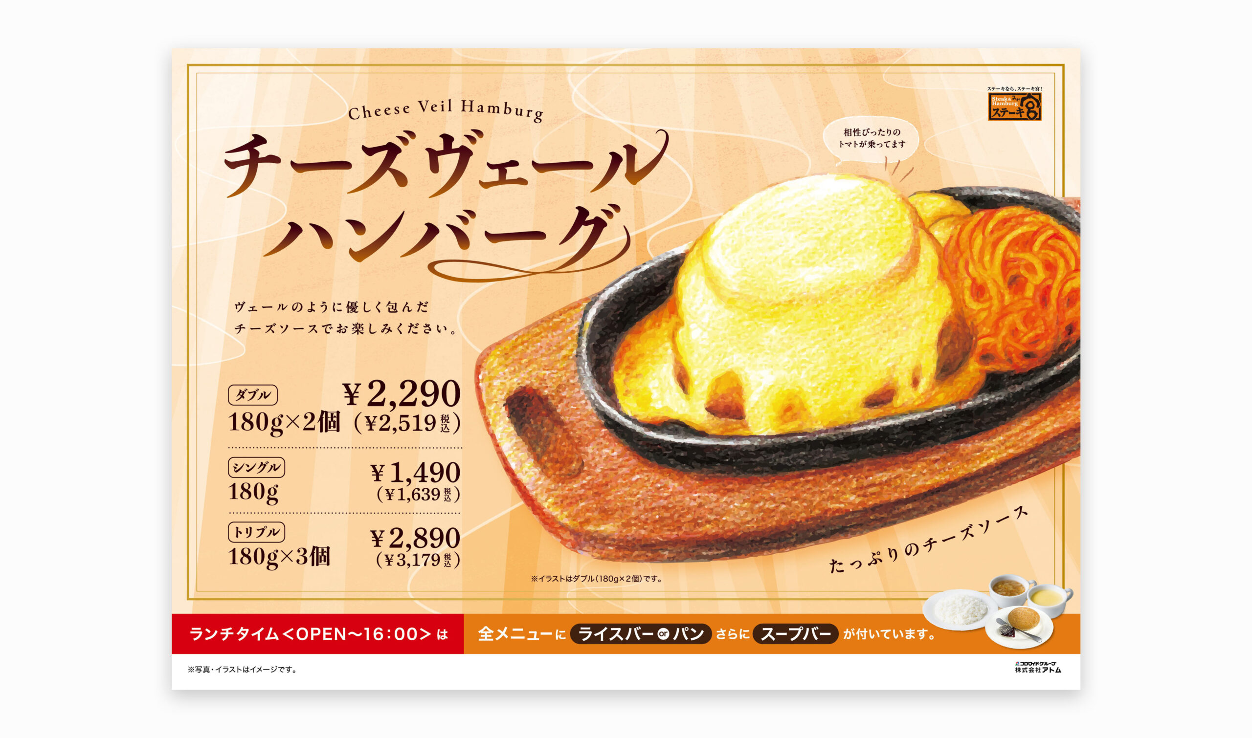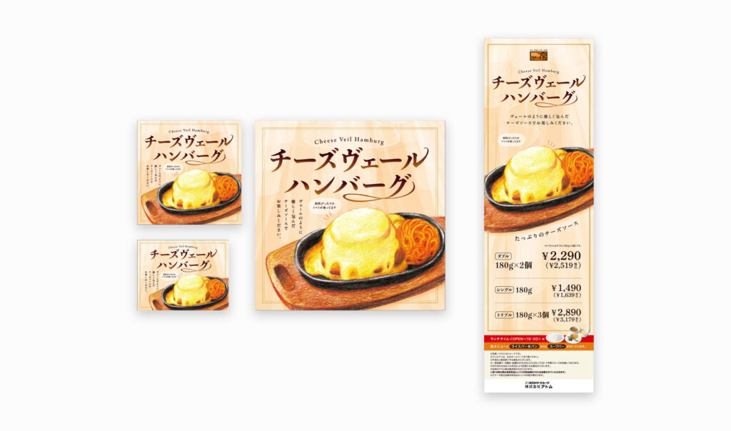 株式会社アトム ステーキ宮 チーズヴェールハンバーグフェア デザイナー/倉前 ディレクター/山川 イラスト/ 倉前